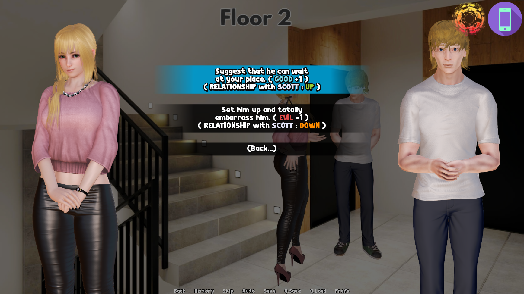 At the beginning of the game, due to a certain accident, Carmen gains the ability to communicate with her three personalities (each corresponding to a specific stat). She can communicate with them at any time of the day or night in real-time. The dialogues change based on the player’s choices and current stats.